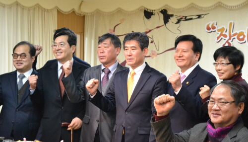 | 신년인사회에 참석한 (사진 왼쪽부터) 최동익 국회의원(민주당), 심재철 최고위원(새누리당), 김완배 상임대표(한국장애인단체총연합회), 변승일 상임대표(한국장애인단체총연맹), 이채필 장관(고용노동부), 장명숙 상임위원(국가인권위원회) 등 내빈들이 축하와 격려의 파이팅을 외치고 있다. |