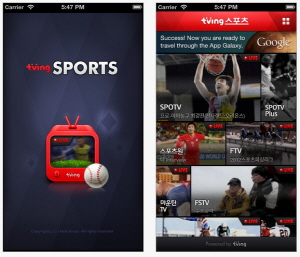 티빙 '스포츠TV' 앱은 총 9개 스포츠 채널을 서비스하며, 국내 스포츠 관련 앱서비스 중에서 가장 많은 채널을 제공한다. 안드로이드와 아이폰 등 대표적인 모바일 환경에서 모두 사용 가능하며 3G, Wi-Fi, LTE 등 모든 통신환경에서 최적화된 영상을 시청 할 수 있다.