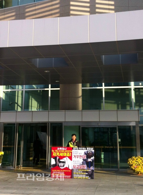 | 복부조례제정 약속 이행을 촉구하는 장용열 전남도교육청 공무원 노조위원장의 지난해말 1인 시위. | ||