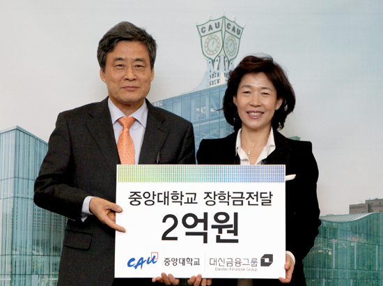 | 이어룡 대신금융그룹 회장(오른쪽)이 중앙대학교 총장실에서 안국신 중앙대학교 총장(왼쪽)에게 장학금 2억원을 전달하고 기념촬영에 나섰다. | ||