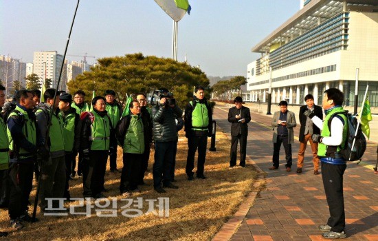 | 신계륜 민주통합당 의원은 14일 전남도의회 앞에서 걸어서 평화만들기 117일째 일정에 앞서 지지자들에게 행사의 의미에 대해 이야기 하고 있다. | ||