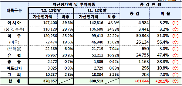 한편 미주지역의 경우 채권자산 규모가 2011년 12월 말 6199억원이었던 것이 1년 만에 3조3583억원으로 급증한 것으로 집계됐다. 유럽 재정위기 국가들의 경우 스페인, 이탈리아는 자산평가액이 큰 폭으로 증가한 반면 그리스는 2011년 말 1억5500만원에 불과했던 평가액마저 1년 만에 거의 '제로' 수준으로 하락했다.