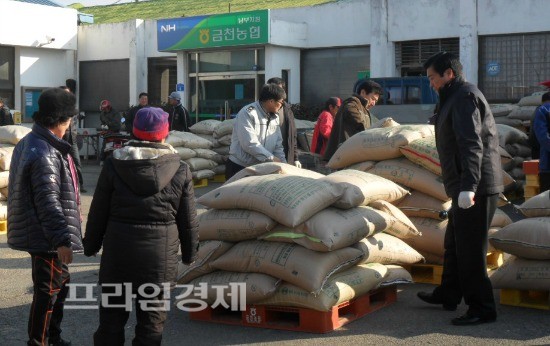 | 정부 비축미 수매현장에서 일손을 돕고 있는 최판호 경위. | ||