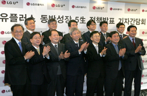 LG유플러스는 15일 서울 중구 프레스센터에서 다산네트웍스, 유비쿼스, 삼지전자, 에어텍, 모임스톤, 다보링크, 유비벨록스 등 10개 협력사 대표들이 참석한 가운데 기자간담회를 열고 동반성장을 위한 5生 정책을 발표했다.