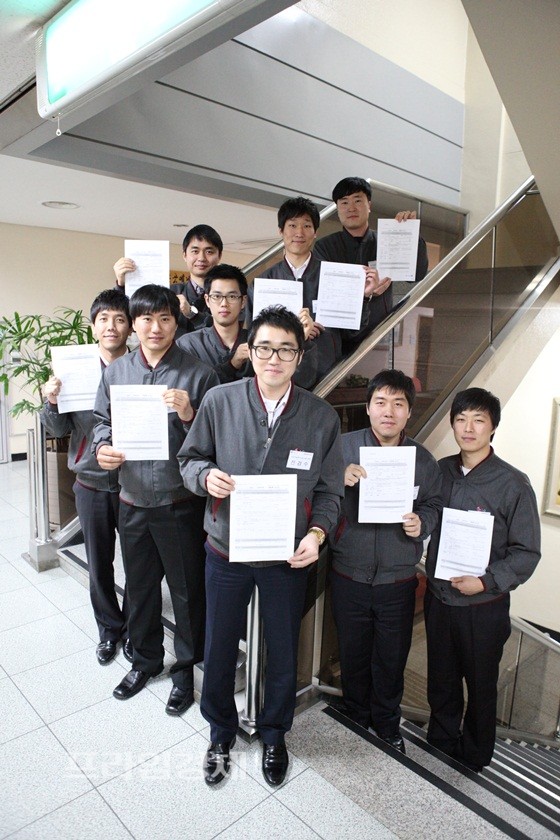 | LG화학 여수공장 신입 직원들이 전입서류를 작성해 들어보이고 있다. 사진은 LG화학 제공. |