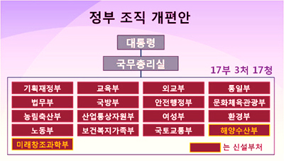 한편 인수위는 15일 현재 15부2처18청의 정부조직을 17부3처17청으로 확대 조정하는 내용의 정부조직 개편안을 발표했다. 특히 교육과학기술부의 과학기술과 지식경제부의 응용 R&D(연구`개발) 부문과 국가과학기술위원회 등을 합친 '미래창조과학부' 신설과 경제부총리제와 해양수산부의 부활이다.