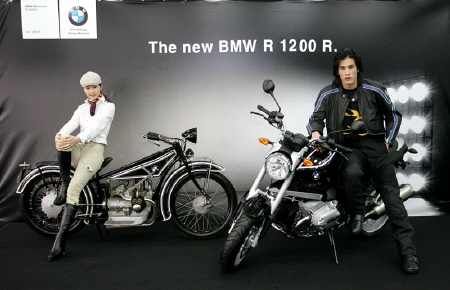 사진= 9일 서울 한남동 BMW 모토라드 서울 전시장에서 열린 포토 행사에서 모델들이 ‘뉴 R 1200 R’를 배경으로 멋진 모습을 연출하고 있다. 사진 왼쪽은 톱 레이싱 모델 이가나(BMW코리아 제공)