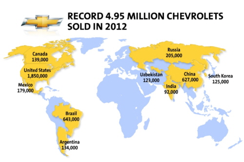 쉐보레 제품은 미국에서 185만대가 판매됐으며, 글로벌 전체 판매량의 60% 이상이 △브라질(64만3000대) △중국(62만7000대) △러시아(20만5000대) △한국(12만5000대) △인도(9만2000대) 등 미국 이외 시장에서 판매됐다.