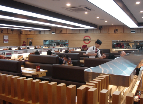 | 회전레일을 중심으로 테이블이 배치된 스시로 매장. 주변사람의 방해 없이 쾌적한 환경에서 식사를 즐길 수 있다. | ||