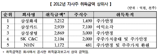 2012년 말 기준 유가증권시장 상장사들은 총 506개사가 64조6000억원, 기업 당 평균 1276억원 규모의 자사주를 보유하고 있는 것으로 나타났다. 그중에서도 자사주 취득금액 상위사로 삼성그룹 금융계열사 세 곳이 나란히 이름을 올린 점이 눈에 띄었다.