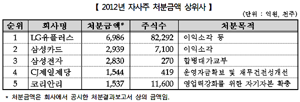 상장협 관계자는 "LG유플러스의 경우 계열사인 LG데이콤, LG파워콤의 흡수합병 과정에서 취득한 자사주를 처분하면서 금액과 비중 상위사로 이름을 올렸다"고 설명했다.