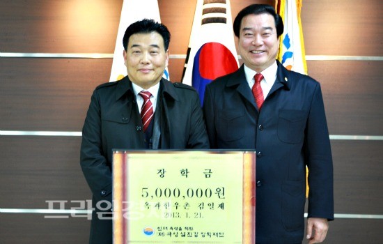 | 한우촌 김일재 사장(왼쪽)은 21일 허남석 곡성섬진간장학재단 이사장(오른쪽)에게 곡성 인재육성을 위해 써달라며 500만원을 기탁했다. | ||
