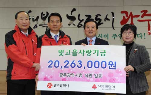 광주광역시(시장 강운태)는 23일 오전9시30분 광주시청에서 '희망2013나눔캠페인'등에 모든 직원이 참여해 모은 성금과 지난해 각종 수상으로 받은 포상금 등 2,026만 3,000원을 광주사회복지공동모금회에 기탁했다.