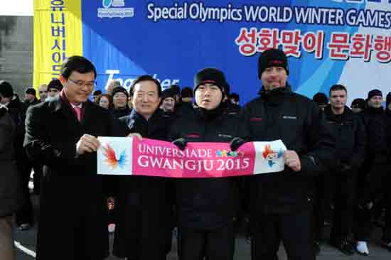 광주시는 2013 평창 동계 스페셜올림픽 세계대회를 홍보하는 성화가 광주에 도착한 25일 오후2시 성화맞이 문화행사를 시청 야외음악당에서 마련했다.