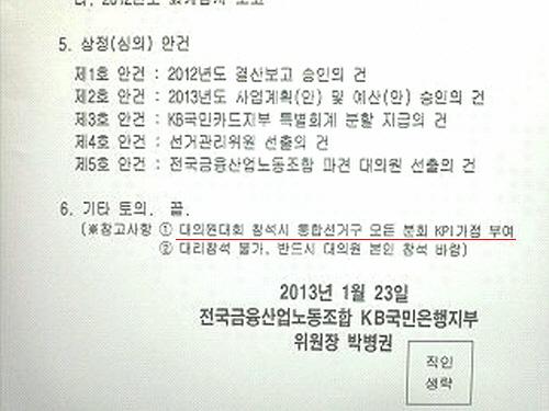 [프라임경제] 서울 여의도의 국민은행 본점에 들른 기자 눈에 하얀 바탕의 종이에 또렷하게 써져 있는 검은 글씨의 대의원대회 소집공고문이 들어왔습니다. 각종 안건을 처리하기 위해 종종 열리는 행사라 새삼스러울 게 없지만, '대의원대회 참석 시 통합선거구 모든 분회 KPI 가점 부여'라는 문구가 눈에 확 들어왔습니다.