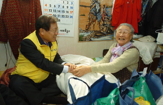 | <현대건설 이종수 사장이 북촌마을 독거노인 세대를 방문, 서산쌀 등 설 선물을 전달하며 이웃 사랑을 실천하고 있다.(사진=현대건설 제공)> | ||