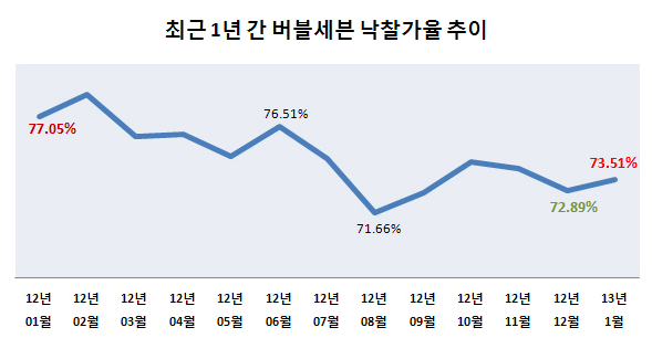지난 1월 한 달간 법원경매가 진행된 버블세븐지역 소재 아파트는 총 580가구로, 낙찰가율이 73.51%에 달했다. 이는 전월 581개 72.89%보다 0.62%포인트 오른 수치며, 낙찰가 총액 또한 기존 791억2185만원에서 862억1549만원으로 70억원 가까이 늘어난 것이었다.