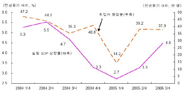 보고서에 따르면 2005년 분기별 국내 경제성장률은 전년 동기 대비 1/4분기 2.7% 개선됐고 2/4분기 3.3%, 3/4분기 4.5%로 지속적으로 나아지고 있는 반면, 취업자 증가폭은 오히려 소폭 감소하고 3/4분기 계절조정 실업률도 0.1% 상승했다.