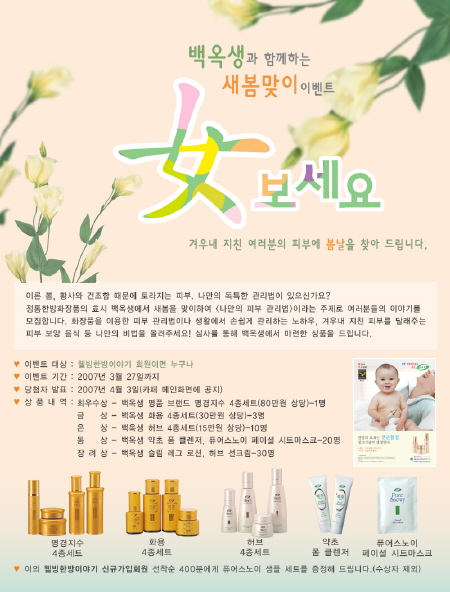 [프라임경제]정통한방화장품의 효시 백옥생 (대표 김성녕)이 다음카페 ‘웰빙한방이야기’ (café.daum.net/wellbeing80)에서 자사의 한방화장품을 상품으로 지급하는 새봄맞이 이벤트 “女보세요”를 진행한다.