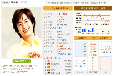스타의 인기도가 주가로 표현되어 스타들간에 치열한 주가 경쟁을 벌이는 사이버 스타증시 엔스닥(www.ensdaq.com)에서 연기자 부문의 선두자리는 금남의 구역이었다. 문근영, 김태희, 송혜교, 전지현 등의 여자연기자들의 높은 인기에 상위 10위권 내에서 남자 연기자들을 찾아보기가 힘들었는데, 여기에 도전장을 내민 스타들이 ‘주몽’의 송일국과 ‘대조영’의 최수종이었는데, 이들에 합류한 스타들이 군 제대 후 가장 활동이 기대되는 송승헌과, ‘욘사마’ 배용준이다. ‘태왕사신기’의 방영 등에 관한 구체적인 스케줄에 대한 보도가 발표되면서 배용준株는 연일 상한가를 달리며 연기자 부문 1위 탈환을 눈앞에 두고 있다.