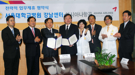 아시아나항공과 서울대학교병원 강남센터는 양사의 우수고객을 대상으로 한 서비스개발에 협력하기 위해 전략적 업무 제휴 협약을 맺었다고 7일 밝혔다.