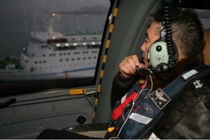 | 김수현 서해해경청장이 헬기 안에서 목포해양경찰서 1508함과 직접 교신하며, 목포신항 인근 해상에서 해맞이 행사에 나선 씨스타크루즈호(1만5000톤, 여객선)와 승선 중인 관광객들의 안전관리를 당부하고 있다.ⓒ 서해해경청 | ||