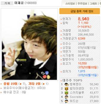 배당 일정이 3월 11일이 예정되어 있어 사이버 증시에서는 마재윤 株 주주들은 물론이고 기존 투자가들도 마재윤 株에 몰리고 있는 상황으로 3월 9일, 현재 마재윤 株는 매수 주문만 25,000주 정도로 팔려고 하는 매물은 동이 난 상태이다. 이 기세라면, 현재 기타종목에서 1위를 고수하고 있는 황우석 박사(10,100원)를 누르고 1위 탈환이 곧 이루어질 전망이다.
