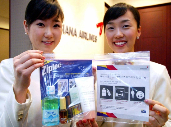 현재 지난 3월1일부터 국제선 기내에 액체류를 가지고 탑승할 때 1리터 이하의 투명한 비닐 지퍼백(20cmX20cm)을 초과하지 않는 선에서 보안검색요원에게 제시할 경우 1인당 1개까지 지퍼백 반입이 허용되고 있다.