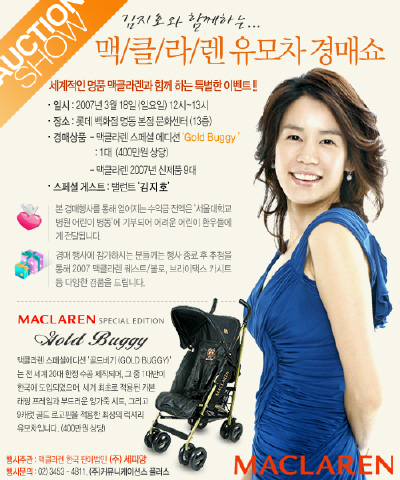 [프라임경제]영국 명품유모차 맥클라렌(www.maclaren.co.kr)은 오는 3월 18일(일요일, 12시~1시) 롯데백화점 명동본점 문화센터(13층)에서 탤런트 김지호씨와 함께 ‘맥클라렌 유모차 자선경매행사’를 진행할 예정이다.
