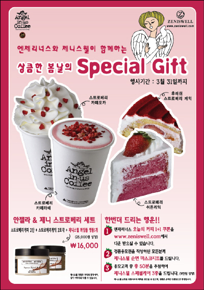 이와 함께 ‘스트로베리 프로모션’실시를 기념해 이달 말까지 스트로베리 음료 2종과 스트로베리 케이크 2종으로 구성된 ‘안젤라&제니 스트로베리 세트(16,000원)’ 구매 시 25,000원 상당의 제니스웰 화장품을 선착순 7,500명에게 증정한다.