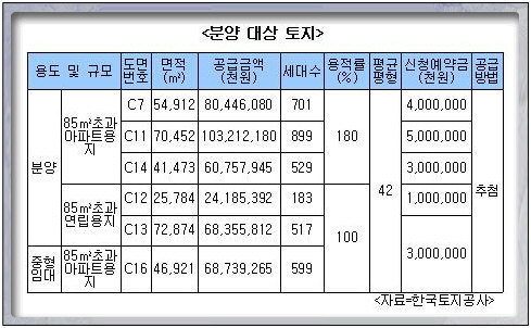 이번에 공급하는 공동주택지는 모두 전용면적 85㎡(25.7평초과)초과 중대형평형으로, 용도별로는 아파트용지 3필지, 16만6837㎡(5만468평), 연립용지 2필지, 9만8658㎡(2만9844평) 및 중형임대 1필지, 4만6921㎡(1만4194평)이다.(표 참고)