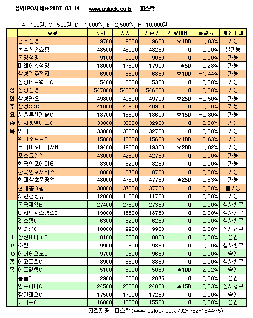 [프라임경제]3월 14일 미국발 모기지 쇼크로 인해 코스닥 시장이 급락한 가운데 장외주요종목들도 약세를 보였다.