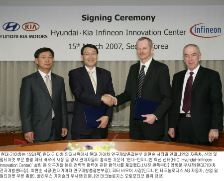 이현순 사장은 “세계 자동차 시장에서 가장 빠른 속도로 성장하고 있는 현대.기아차와 차량용 반도체 분야 선도 기업인 인피니언의 핵심 역량 시너지를 통해 고객만족 실현을 위한 혁신적 제품 개발에 나서겠다”고 역설했다.