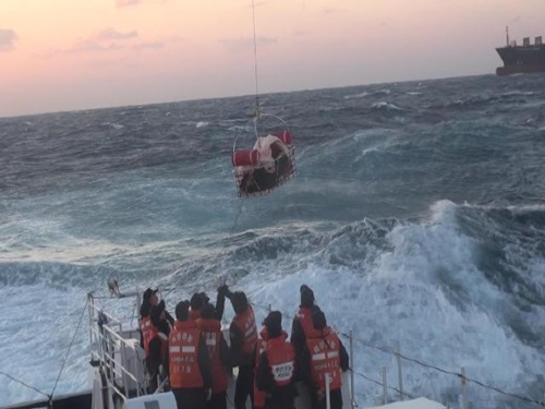 | 해경이 4일 침몰된 선박에서 표류중인 선원들을 구조하고 있다. ⓒ 여수해경 | ||