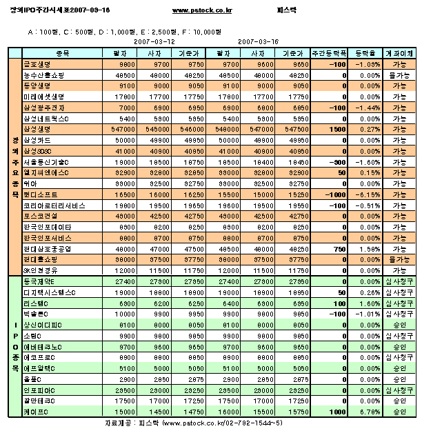 [프라임경제]3월 3째주 장내시장은 미국발 모기지 쇼크로 인해 주춤했으나 주후반 반등에 성공하며 오름세로 마감된 반면, 장외주요종목은 약세가 우세한 모습을 보였다.