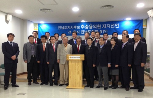 전현직 전남도의원 91명(현직 도의원 11명 포함)은 7일 오후 2시 전남도의회 브리핑룸에서 기자회견을 열어 "주승용 의원을 새정치민주연합 전남도지사 후보로 적극 지지할 것을 선언한다"고 말했다.