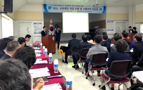 [프라임경제] 전남구례교육지원청(교육장 정봉호)은 8일 오후 2시 구례교육지원청 3층 대회의실에서 장만채 전남도교육감과 일선 학교장, 학부모 대표 80여명이 참석한 가운데 '2014 교육현장 의견 수렴 및 구례지역 간담회'를 개최했다.