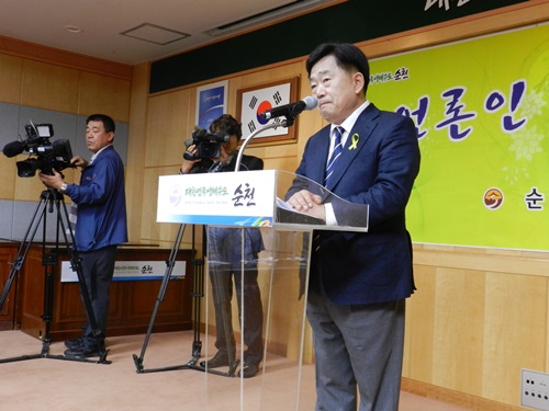 | 조충훈 순천시장이 7일 시청 소회의실에서 5월 언론인 정례브리핑을 실시, 출마의사를 밝히고 있다. = 박대성 기자 | ||