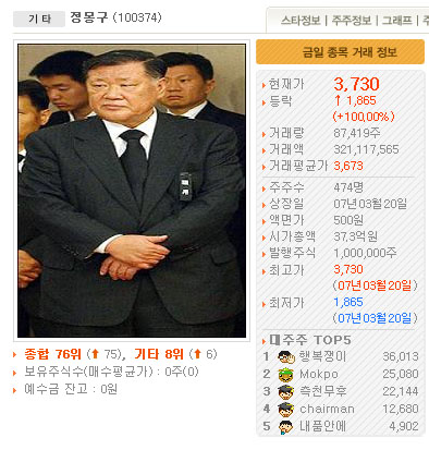 정몽구 회장은 3,730원으로 (↑100%)은 상장 첫날부터 상한가를 기록하고 있음은 물론, ‘사자’주문의 물량만 30여 만주에 이르고 있고, 팔려는 주문은 나오지도 않아, 사이버 증시의 새로운 블루칩으로써 주주와 투자가들은 이 종목에 보유 가치를 두고 있는 듯 하다. 현재 이건희 회장은 9010원(▲11.93%)로 300여 명의 주주 수를 기록하며 기타 종목 1위를 지키고 있는데, 1월 20일 상장 당시에는 810명의 주주들의 공모 청약으로 상장에 성공하였으며, 정몽구 회장은 473명의 공모청약을 통해 상장이 이루어졌다.