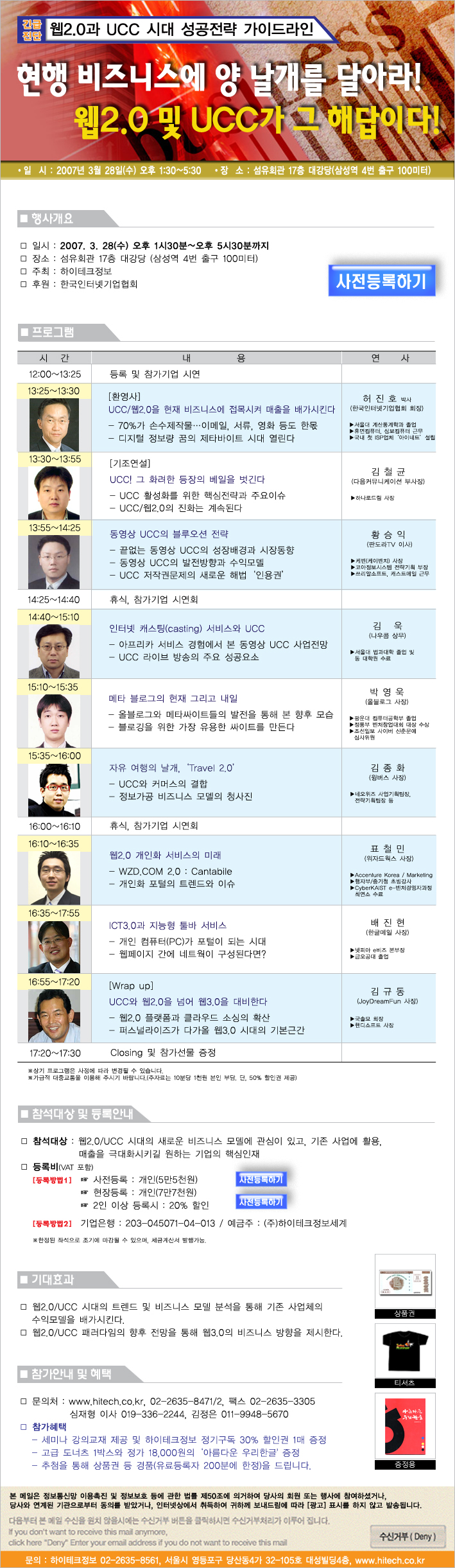 [프라임경제]하이테크정보(발행인 김영실 www.hitech.co.kr)와 한국인터넷기업협회(회장 허진호)는 오는 28일(수) 섬유센터 17층 대강당에서 ‘웹2.0 및 UCC시대 성공전략’이란 주제로 세미나를 개최한다.
