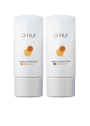 가격은 오휘 퍼펙트 선블록 레드 SPF 50+ PA+++ 각 60ml, 35,000원 오휘 퍼펙트 선블록 블랙 SPF 50+ PA+++ 각 60ml, 35,000원