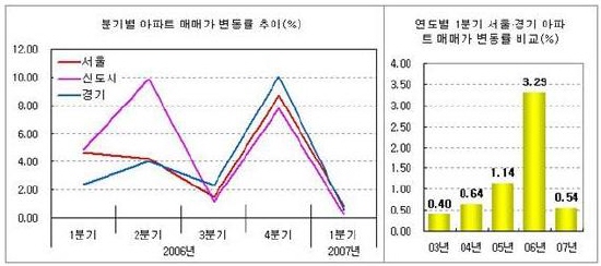 스피드뱅크(www.speedbank.co.kr)가 1분기(3월22일 기준) 서울·경기지역 아파트값 변동률을 조사한 결과, 서울 0.84%·신도시 0.26%·신도시를 제외한 경기도는 0.56%를 각각 기록했다.