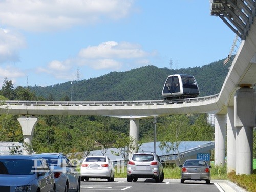 | 순천만에 운행되는 PRT '스카이큐브'. 멀리서보면 귀여운 삼각김밥 모양이다. = 박대성 기자 | ||