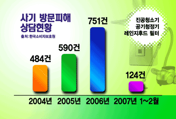 진공청소기 방문판매원들은 청소업체를 빙자하거나 홍보차원에서 무료로 청소해 주겠다고 접근한 뒤, 성능 확인이나 사용법을 알려준다는 명목으로 제품을 개봉, 사용해 보도록 유도하고 이를 이유로 제품구입을 강요해 문제가 됐습니다.