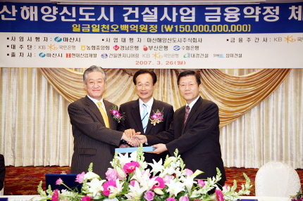 [프라임경제] KB국민은행은 마산해양신도시 건설을 위한 마산해양신도시 건설사업에 대하여 금융주간사로서 건설자금으로 총1,500억원 규모의 신디케이티드 대출 주선을 완료하고 26일 마산시 사보이호텔에서 사업시행자인 마산시(시장 황철곤) 및 사업대행자인 마산해양신도시㈜(대표이사 이상문)와 금융약정식을 가졌다.