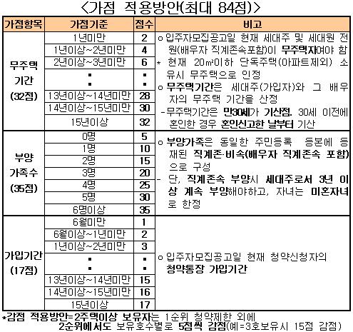 무주택 기간은 1년 미만이 2점, 1년이상~2년미만이 4점이다. 이렇게 계산해 15년 이상이 32점으로 최고 점수를 받게 된다.