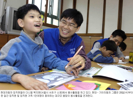 28일 서울 서초구 ‘다니엘 복지원’을 방문, 정신 지체 아동을 도운 현대차 김동진 부회장은 “현대차를 비롯한 그룹의 사회봉사활동은 임직원들의 자발적이고 열정적인 동참으로 이뤄지고 있다”며 “앞으로도 소외된 이웃과 함께 하며 기업 시민으로서의 역할을 충실히 수행해 나갈 것”이라고 약속했다.