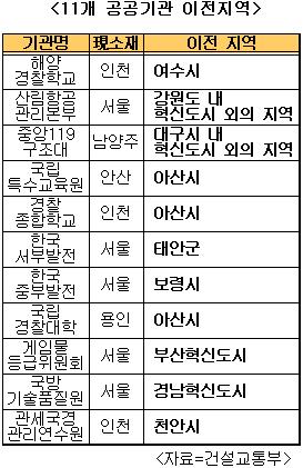 [프라임경제]11개 공공기관의 이전 지역이 확정되었다. 3일 국가균형발전위원회(위원장 성경률)는 건교부가 심의요청한 해양경찰학교 등 11개 공공기관의 이전지역(표 참고)을 심의·의결했다고 밝혔다.