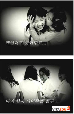 또 다른 '친구' 동영상은 최근 입시로 인해 같은 교실 내에서도 경쟁 상대가 되버린 학생들에게 "힘들때만 친구를 찾지 않나요? 기쁠 때 함께 하면 더 좋은 것이 친구"라고 전하며 "함께하는 시간 속에 서로 닮아가는 것"이라고 친구의 의미를 일깨워준다.