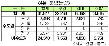 4월 분양계획 3만1844가구는 지난달 계획물량 2만1737가구보다 46%, 3월 실제 분양물량1만4863가구보다 214%나 늘어난 수준이다.